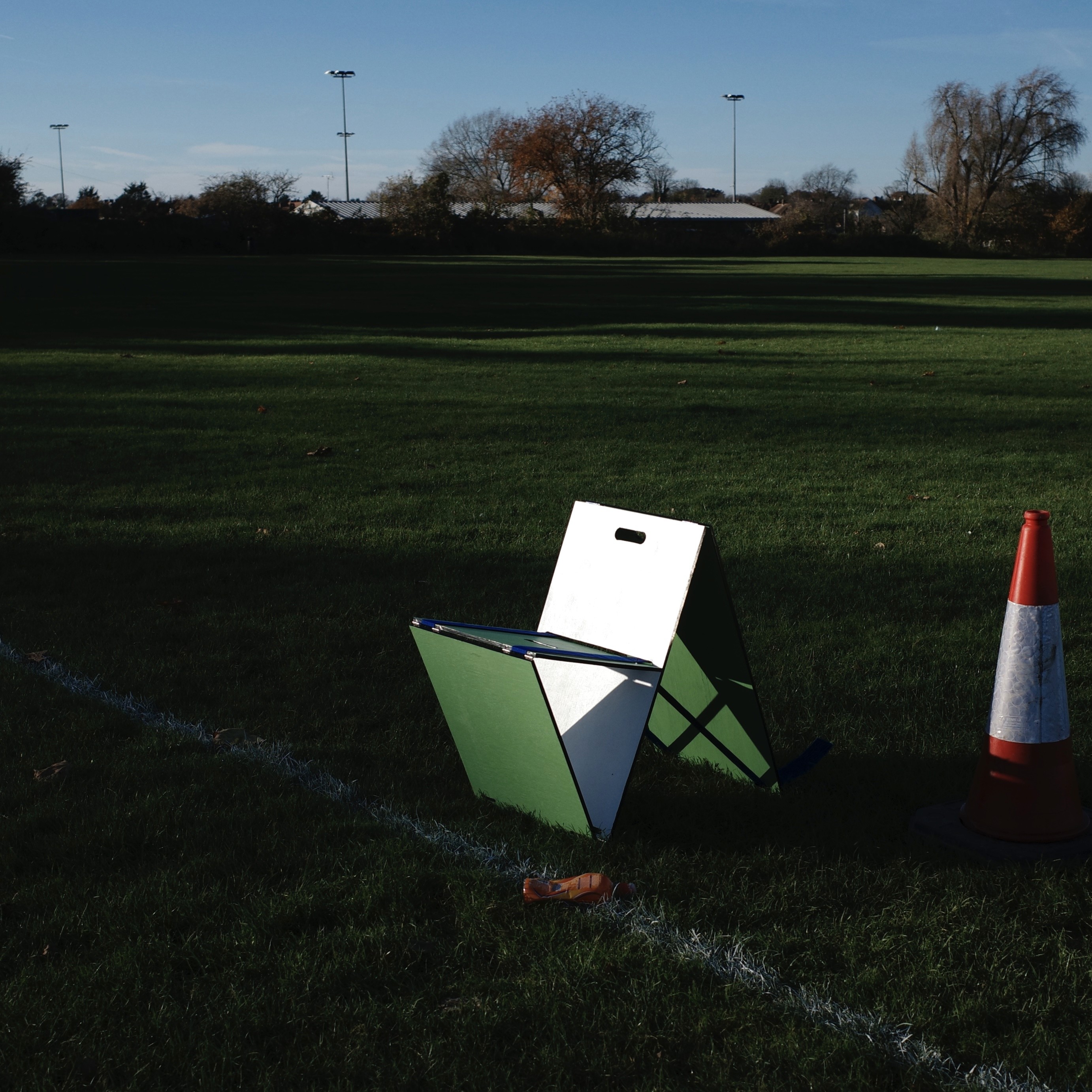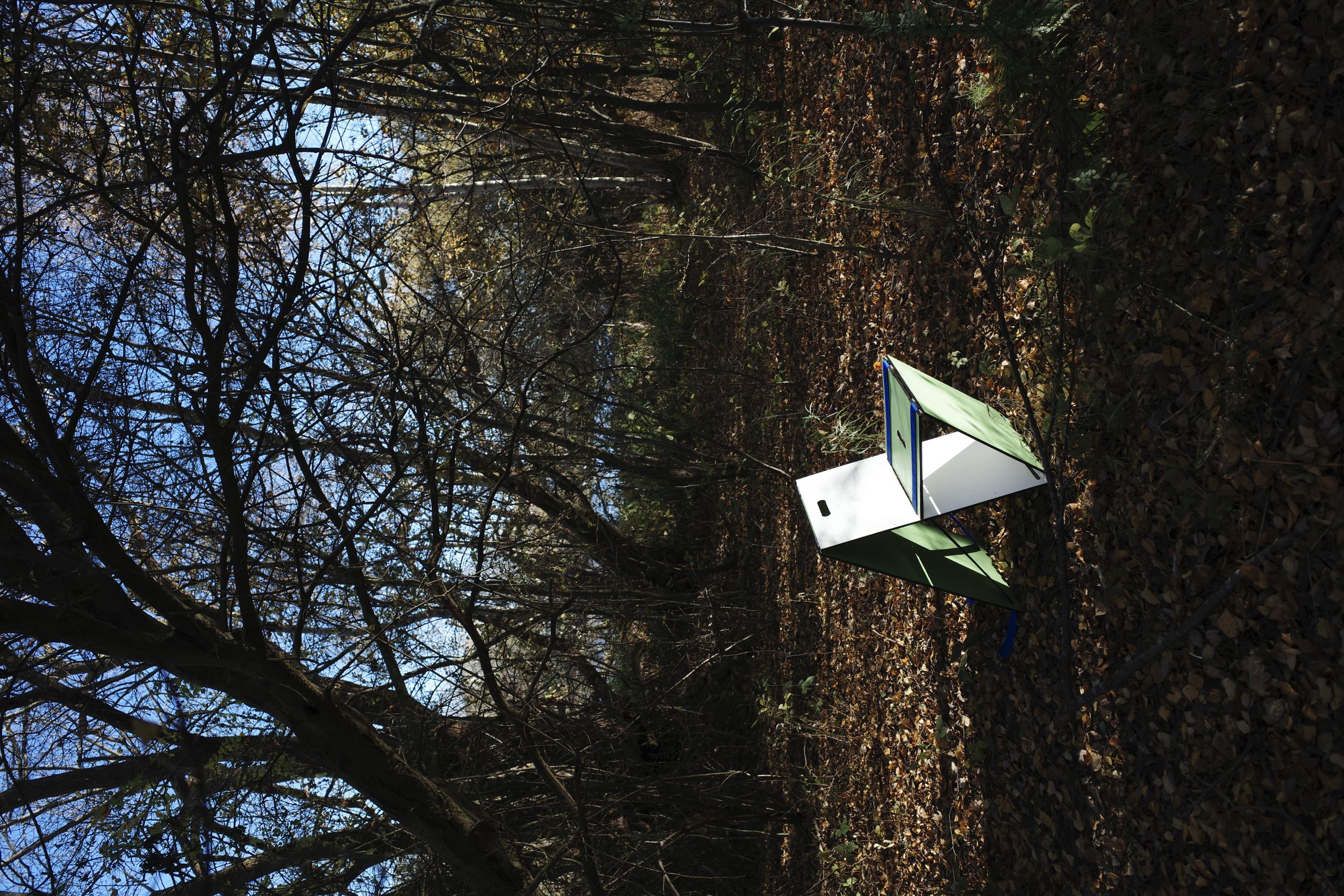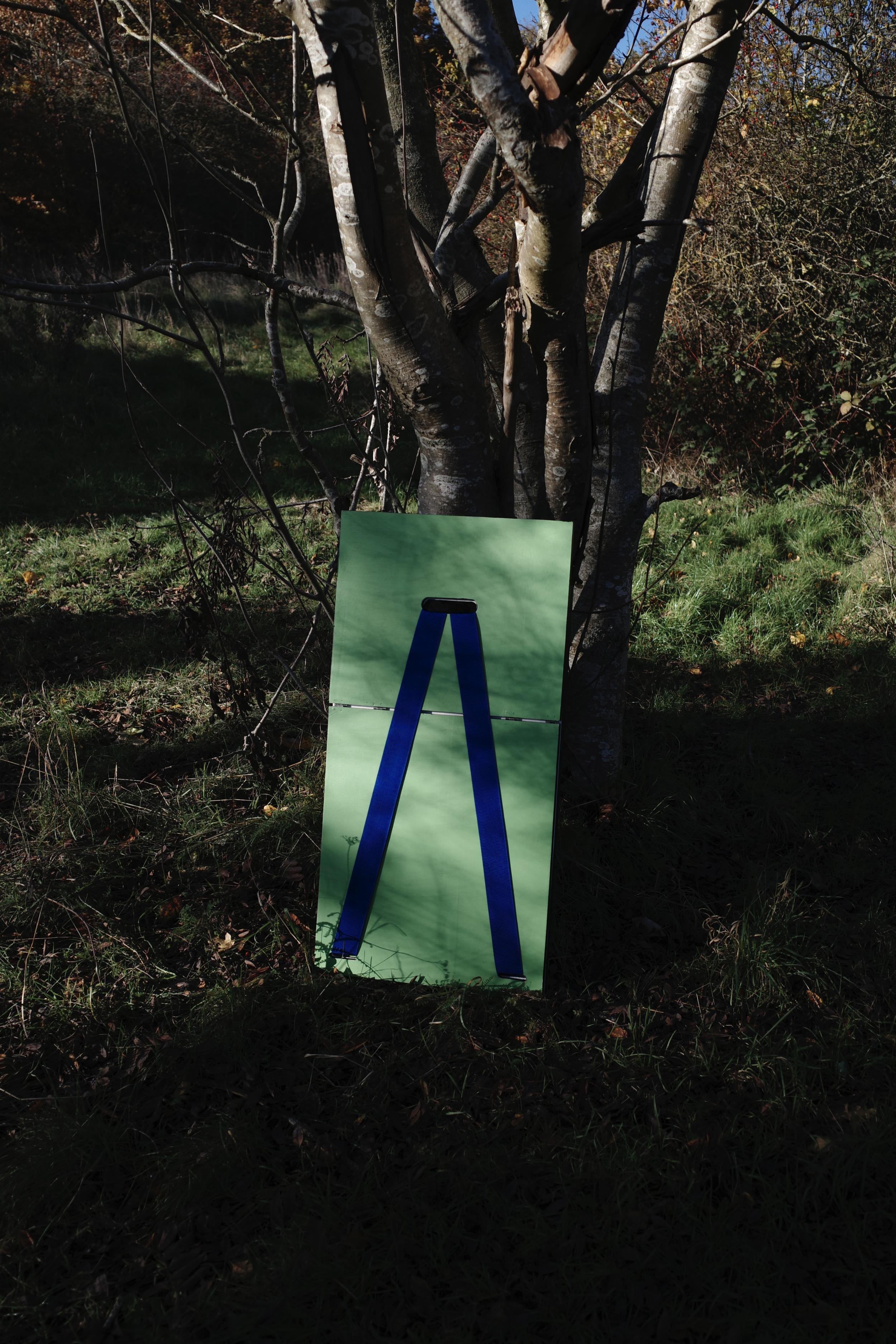 The design takes inspiration from the yellow warning sign, especially its ability to temporarily occupy space and alter the identity of a place. I was interested in how a simple folded object could signal presence, function, and provisionality at the same time. Through the pairing of two wooden panels, the object changes its character depending on angle, closure, and use, allowing it to occupy space in multiple ways.