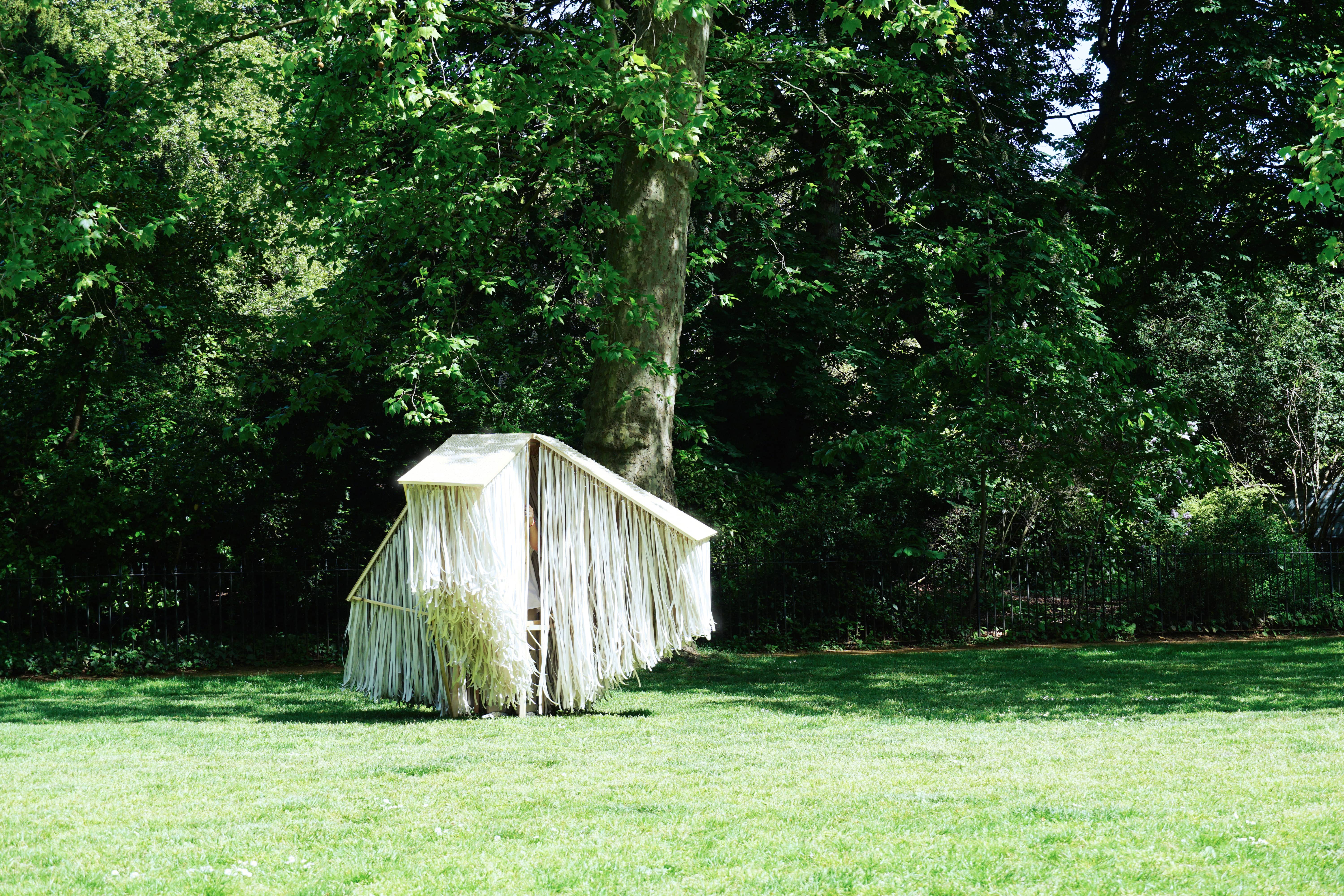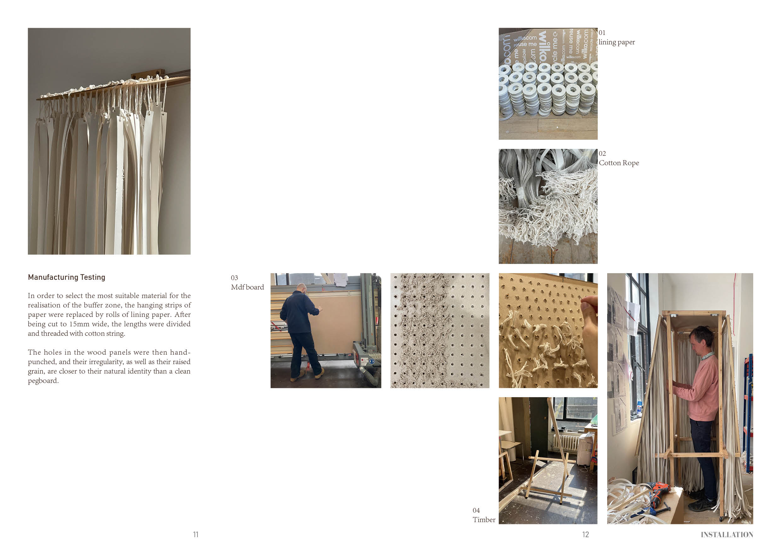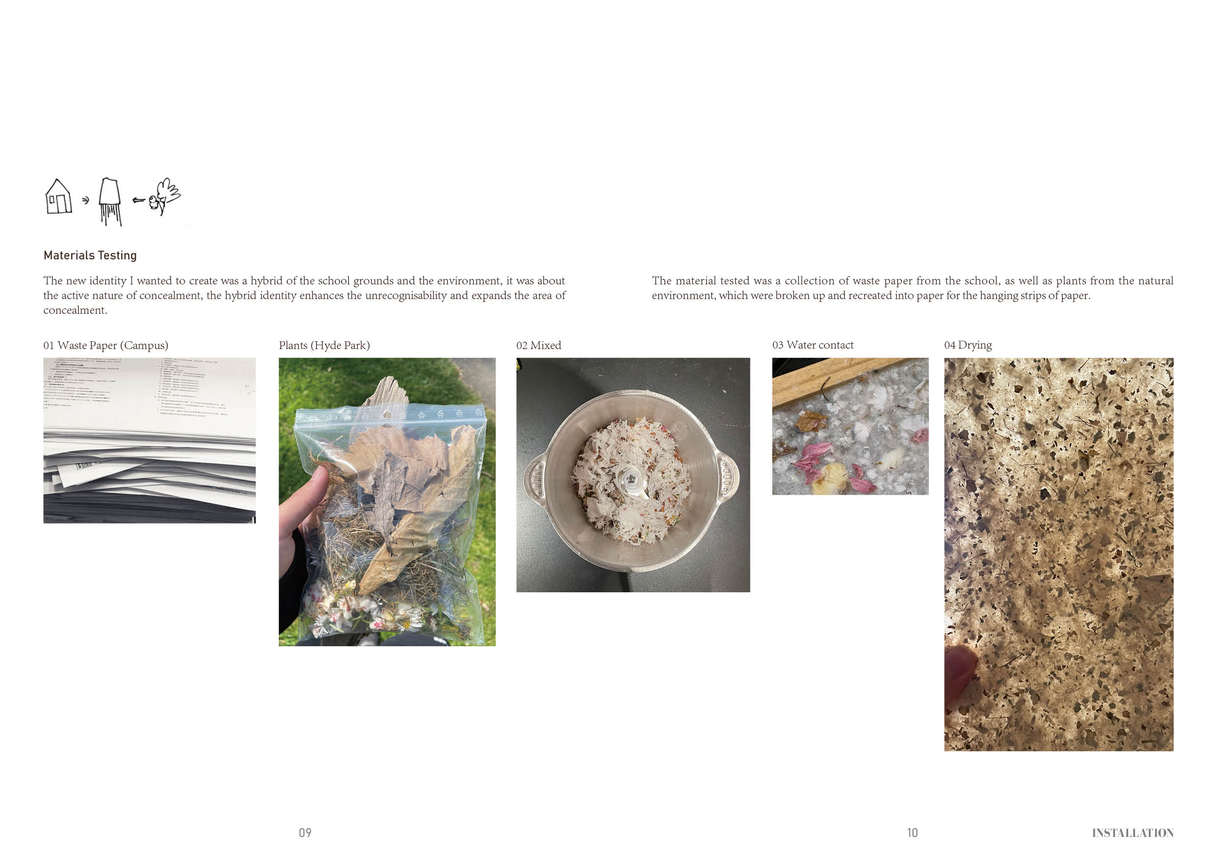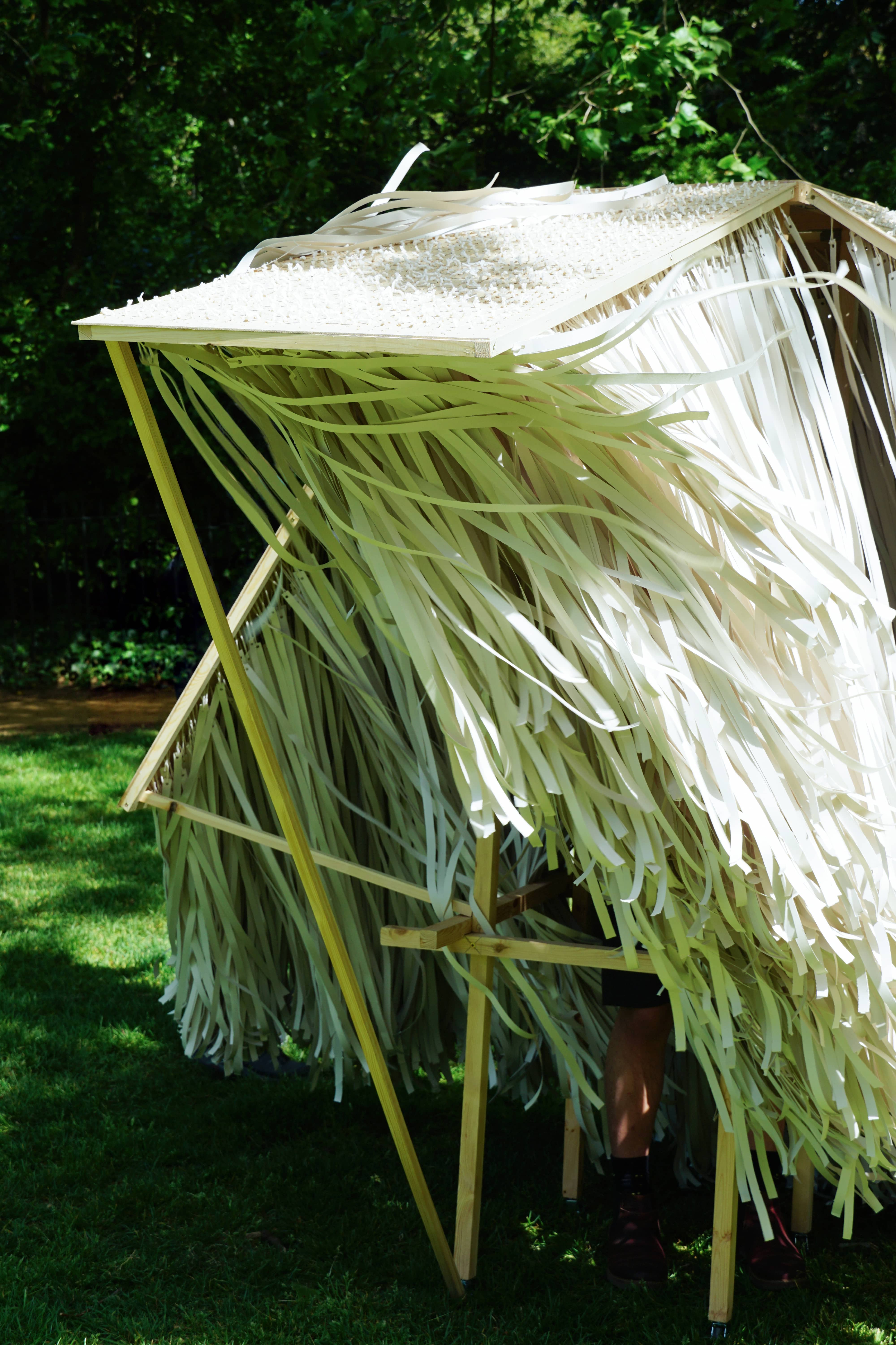 The final installation proposes a mobile shelter that can respond to changing environmental conditions through different degrees of openness. Timber panels form a protective shell, while hanging paper strips create a soft and ambiguous outer layer that blurs boundaries with the surroundings. In its closed state, the structure offers maximum concealment while maintaining limited visual access through small openings; in its open state, the released strips expand its hidden zones and allow the environment to reshape its appearance. The work ultimately imagines escape not as a single act of departure, but as a continuous negotiation with exposure, vulnerability, and transformation.
