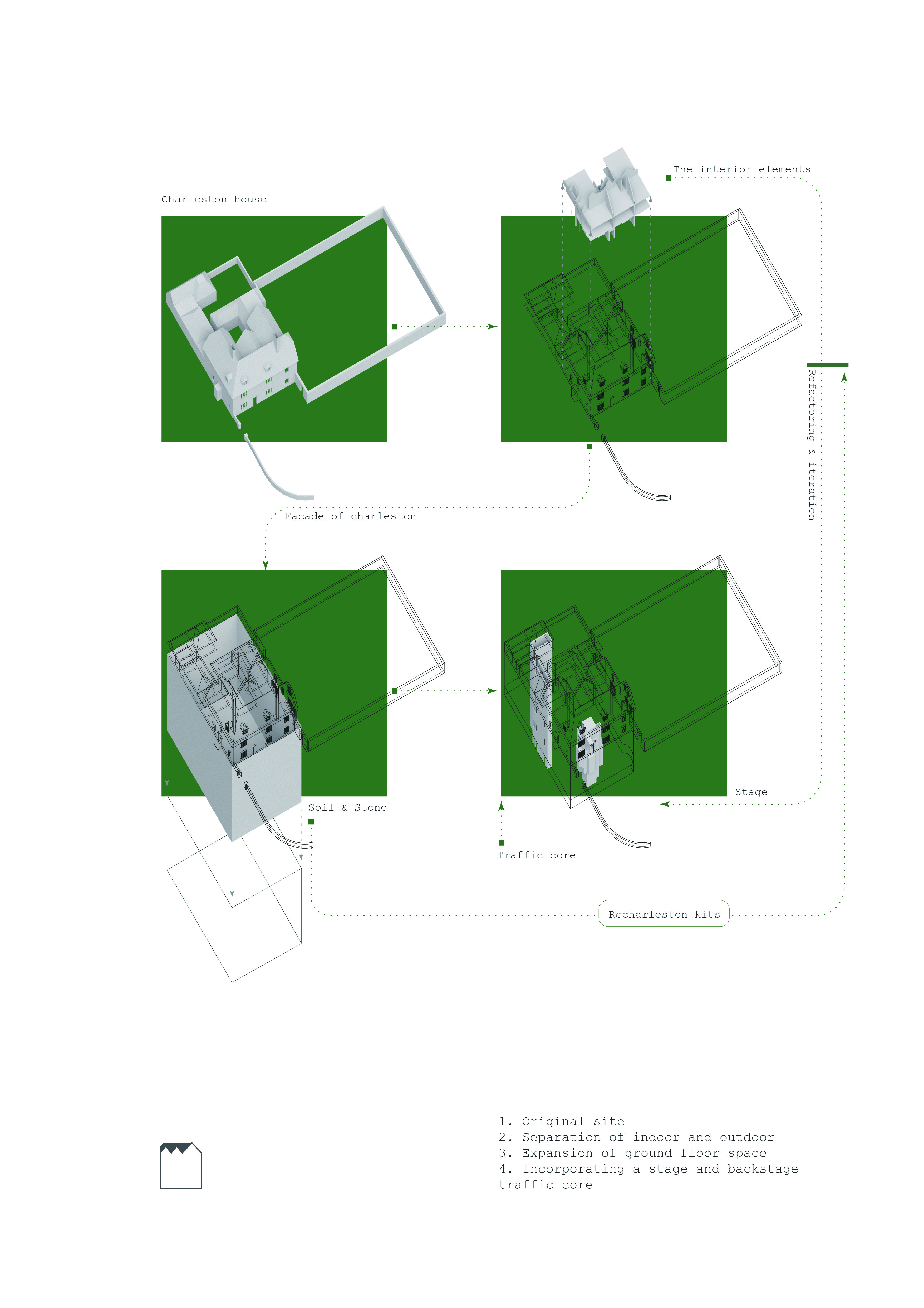 Using Charleston House as the narrative and spatial point of departure, the project constructs a new interior ritual around food. A sequence involving entry, harvesting pills, seeking flavours, and infusing personal food units with the atmosphere of Charleston. I treated space not simply as a backdrop, but as an active apparatus for staging movement, posture, perception, and transformation. Through this sequence, consumption shifts from a neutral act of intake into a choreographed encounter between body, memory, and environment.